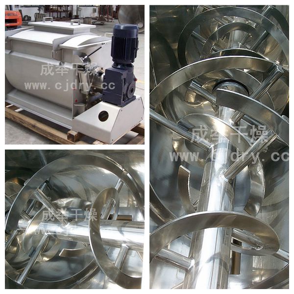 臥式螺帶混合機由U形殼體、螺帶攪拌放入葉片和傳動部件組成;螺帶狀葉片為雙層內外結構,外層螺旋將物料從兩側向中央匯集,內層螺旋將物料從中央向兩側輸送,形成對流混合。